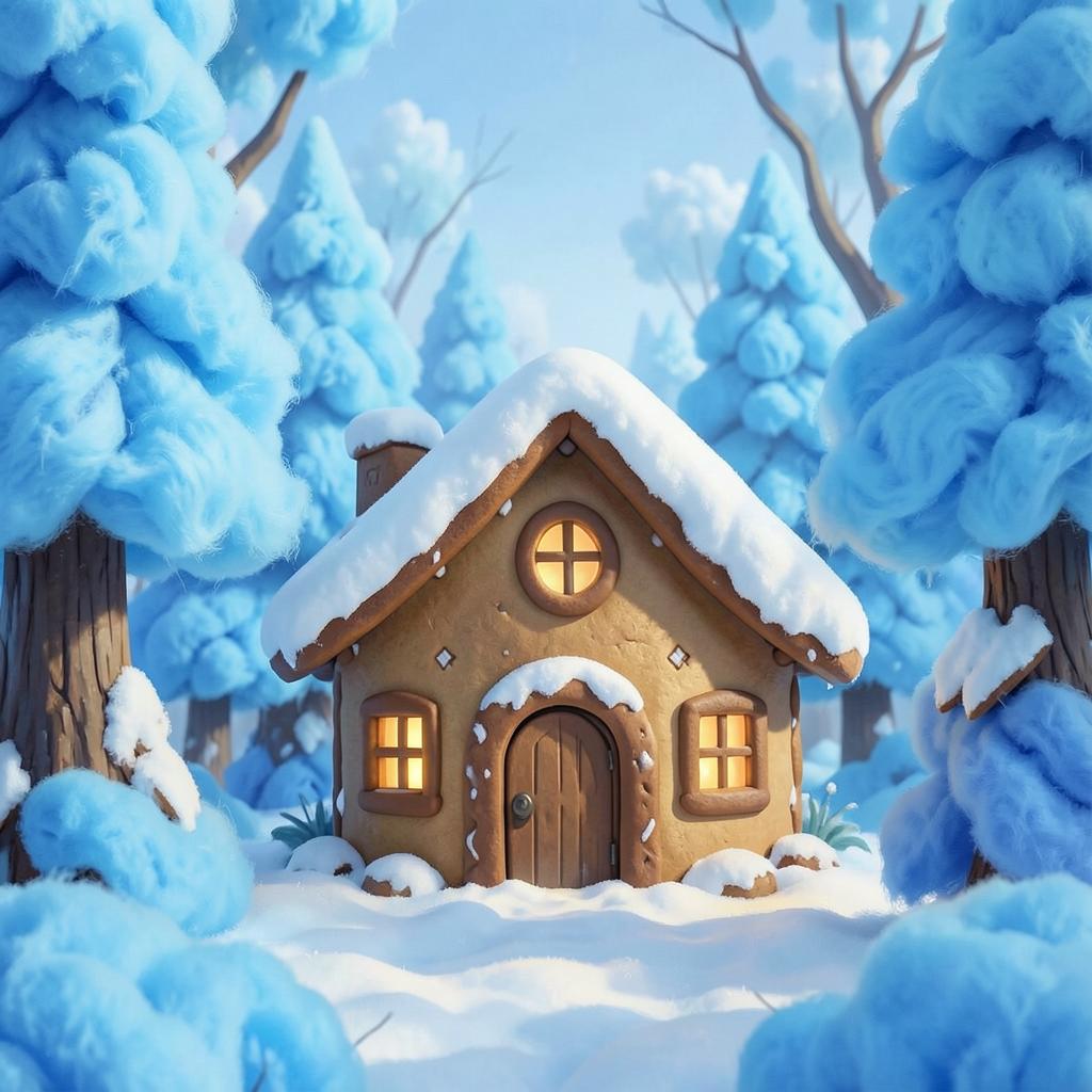 "A cozy cottage made of gingerbread in a forest of blue cotton candy trees, digital art style"